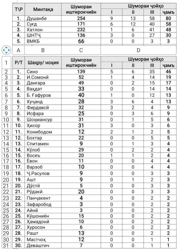 Тибқи иттилои манбаъ, хонандагони муассисаҳои шаҳри Душанбе бо гирифтани 80 ҷойи ифтихорӣ (9 медали тилло, 13 медали нуқра ва 58 медали биринҷӣ) дар ҷойи якум қарор гирифтанд. Ҳамзамон хонандагони муассисаҳои вилояти Суғд сазовори 58 ҷойи ифтихорӣ (6 медали тилло, 12 медали нуқра ва 40 медали биринҷӣ) ва вилояти Хатлон- 48 ҷойи ифтихорӣ (1 медали тилло, 6 медали нуқра ва 41 медали биринҷӣ), шаҳру ноҳияҳои тобеи ҷумҳурӣ- 30 ҷойи ифтихорӣ (3 медали тилло ва 27 медали биринҷӣ) ва Вилояти Мухтори Кӯҳистони Бадахшон соҳиби 3 ҷойи ифтихорӣ (3 медали биринҷӣ) гардид.